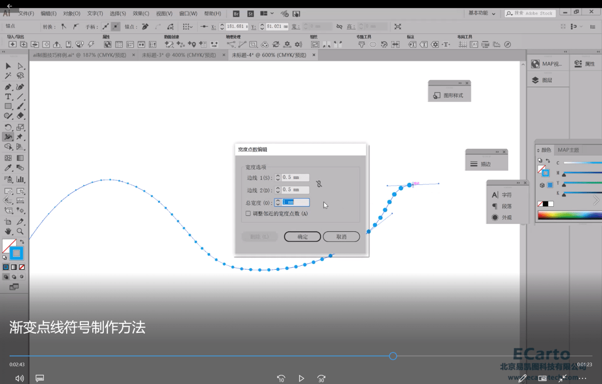 以下是在Adobe Illustrator中使用虚线描边与宽度工具实现消失河段符号的操作,其他类型的河流渐变符号(如地面河流、时令河、干河床等)的制作方法类同。