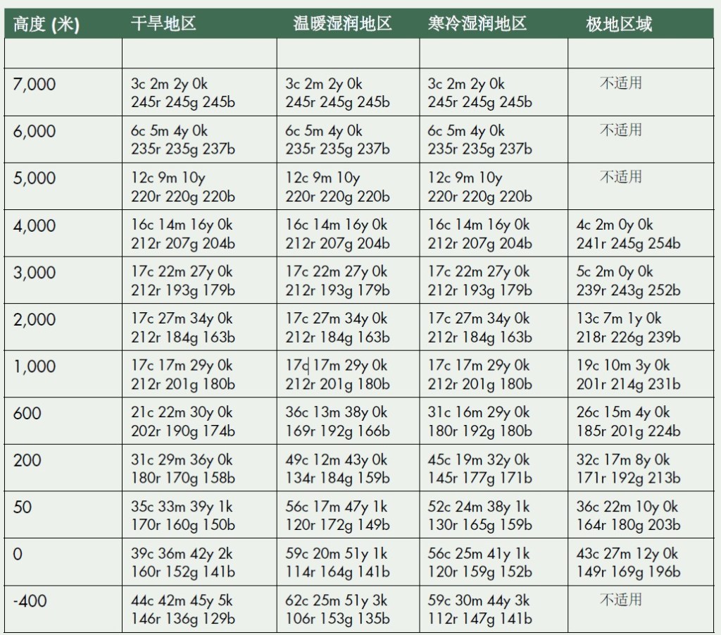 在颜色配置过程中,高程仍然是占主要的因素,只是根据不同的环境区域使用不同的配色方案,如图5所示。
