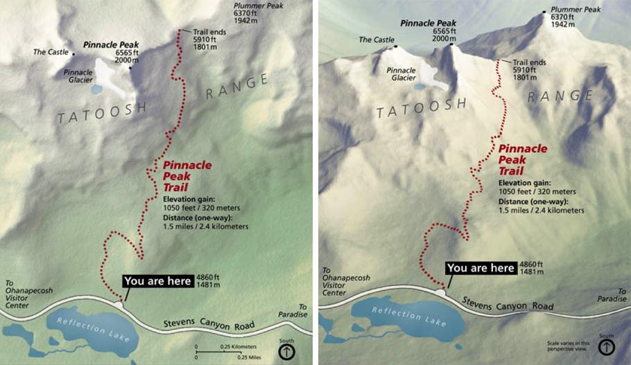 三维地图又叫3D地形、3D场景、3D斜视图、全景图等,由于三维地图的制作考虑的因素和特点比较多,比如制作的时间和成本高,数据要求也更高,同时具有以下几个特点:无地理参考信息,观测角度固定,地图的上下方向还有变形等等。但是制作3D地图也有充分的理由,看起来更有趣,更能吸引读者的注意力,与传统的带等高线或山体阴影的地图相比,3D斜视地形更容易让普通大众理解,除了X、Y维度外,还展示了垂直方向的维度,如下图所示: