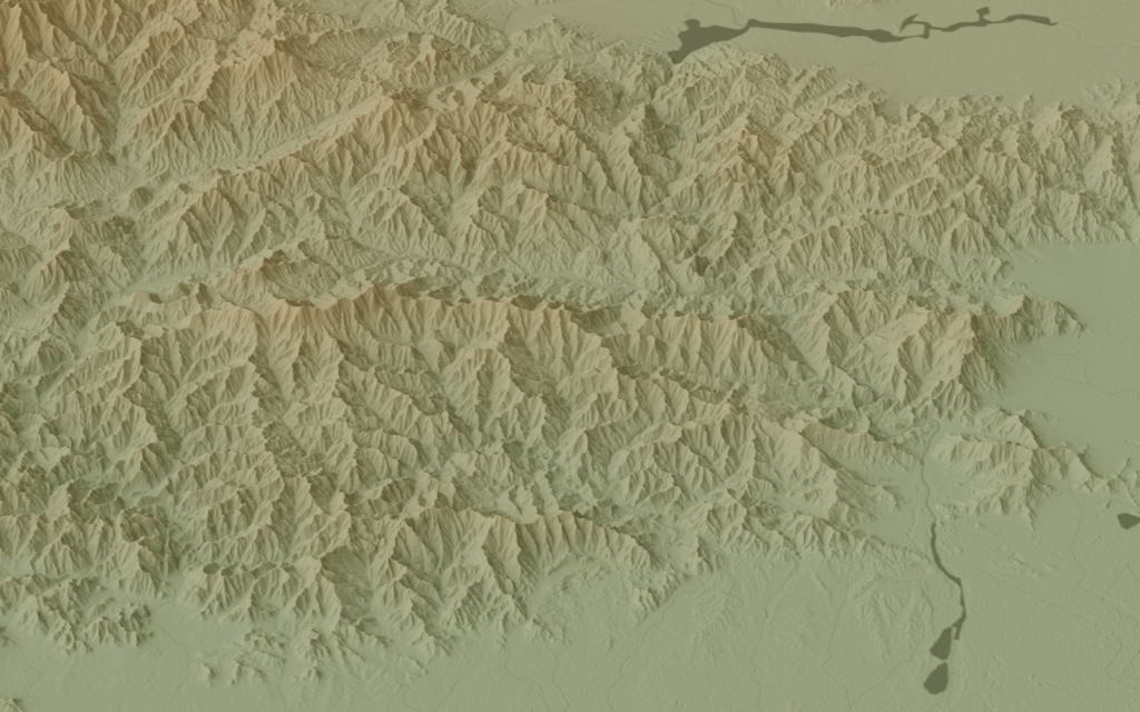 以上是地形渲染的成果,如果输出的分辨率比较高的话,对机器要求会比较高,根据机器性能情况,该过程可能需要几小时甚至更长的时间。通常情况下,上述成果即作为渲染成果直接在制图中进行使用,如果想叠加颜色或图像纹理,也可以设置颜色渐变或者叠加卫星影像生成更真实的晕渲效果。如图3、4所示: