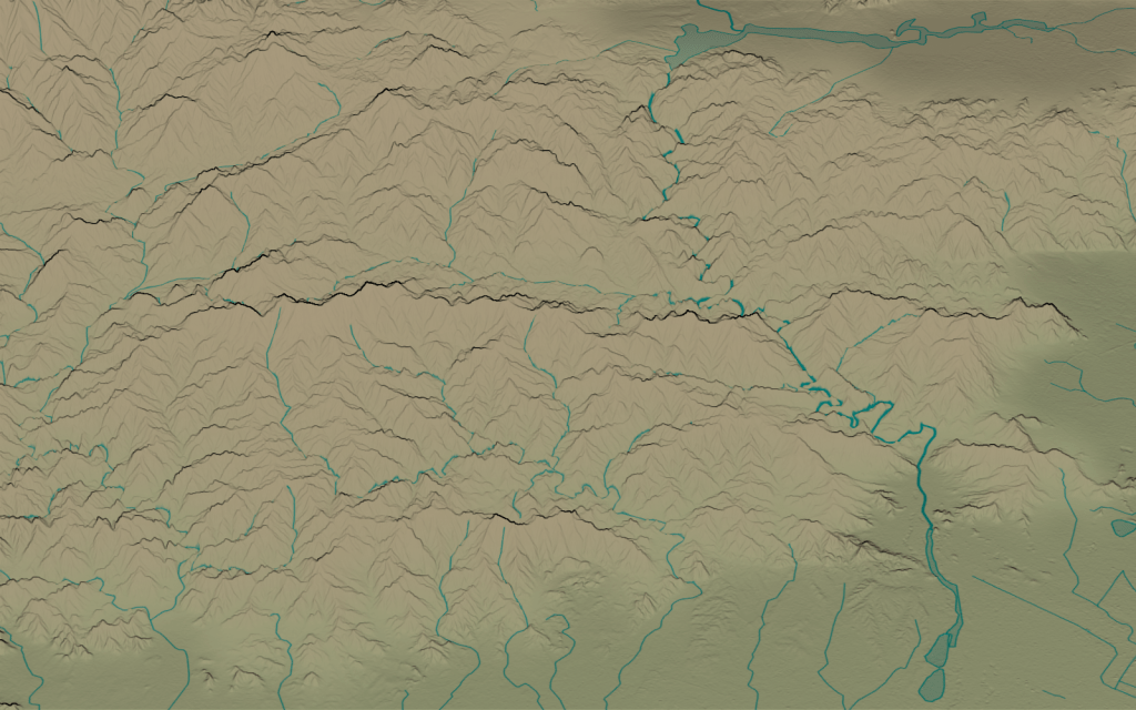 由于上述的三维地形建模结果不具有地理参考,同时垂直方向还有一些变形,跟矢量数据是不能直接套合的,如果需要叠加的矢量数据,可以事先在GIS软件中裁切成与DEM相同的范围(可以通过MAPublisher或Geograhic Imager完成),另存为栅格图层,然后在渲染时作为图像层嵌入,如上图2所示,也可以在Blender中修改着色器,将其渲染成单独的图层,如图7所示,这样便于在Photoshop或Illustrator中进行叠加和重新描摹。图8是使用同样的方式将DEM作为颜色输入的渲染结果,图9是将卫星影像作为颜色输入的渲染结果。