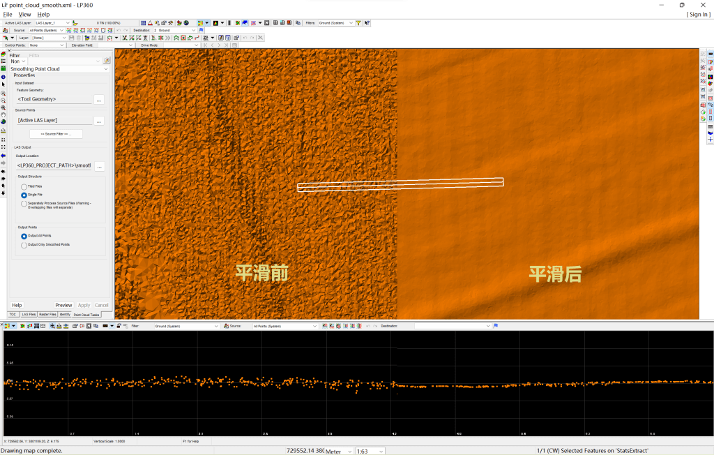 由于LiDAR扫描设备的精度有高有低,以及LiDAR的多次回波特性,造成生成的地面点云会有较大的起伏,特别是非测量无人机Lidar扫描仪生成的点云,这时需要有通过点云平滑操作,来提高地形的生成精度,今天我们介绍如何使用LP360 软件的”smoothing point cloud(平滑点云)”点云任务对点云进行平滑处理。