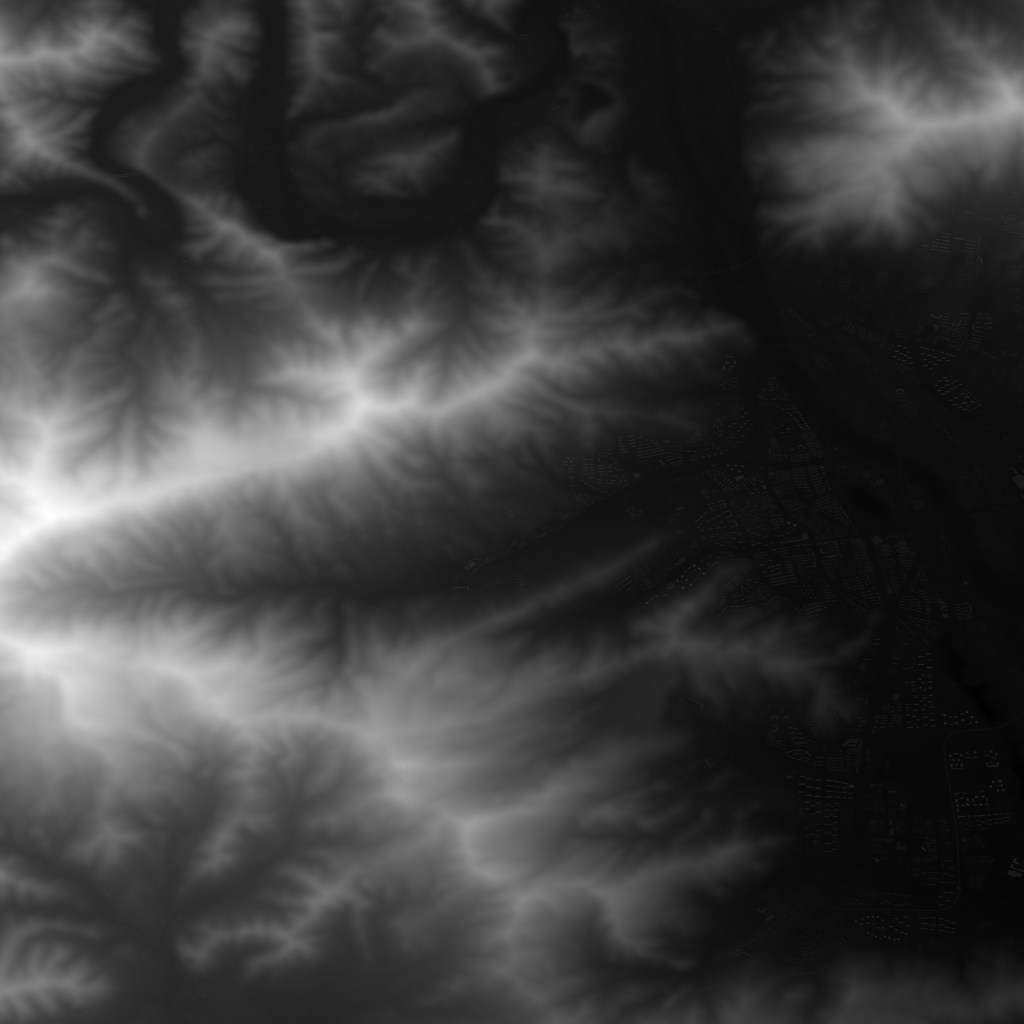 本教程演示了利用Geogrpahic Imager地形晕渲功能在Adobe Photoshop中轻松制作地形晕渲效果,同时分享了一些Photoshop增强图像的技巧。首先,我们从打开一个原始的北京西部地区的DSM数据开始,这是一张黑白的图片,其中亮度高的部分代表地势比较高的区域,亮度比较暗的部分代表地势比较低的区域。