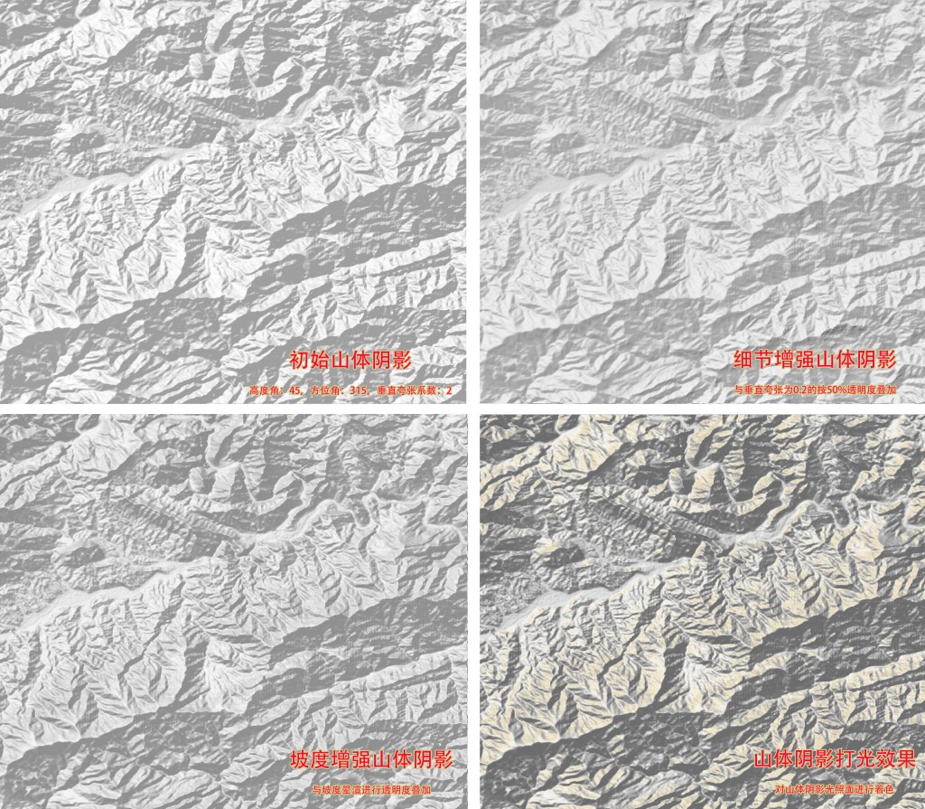 这个图看着并不复杂,猜想的大概思路是:地形晕渲做底,上面叠加影像,再用特殊纸张压制凹凸处理。按照这个思路,我进行了第一次试做,但结果并不理想。颜色不好看,晕渲特别细碎,清晰度也很差。在寻求解决方案的过程中,我发现地图学家Tom Patterson的个人网站里分享了很多他的制图经验和作品,其中有一篇文章刚好讲到了如何用Photoshop对DEM数据进行预处理,以便于得到更好的地形晕渲效果。特别感谢这位前辈,按照文章步骤尝试后,找到了相对效果较好的参数设置。以下是对DEM进行预处理前后的晕渲效果细节对比: